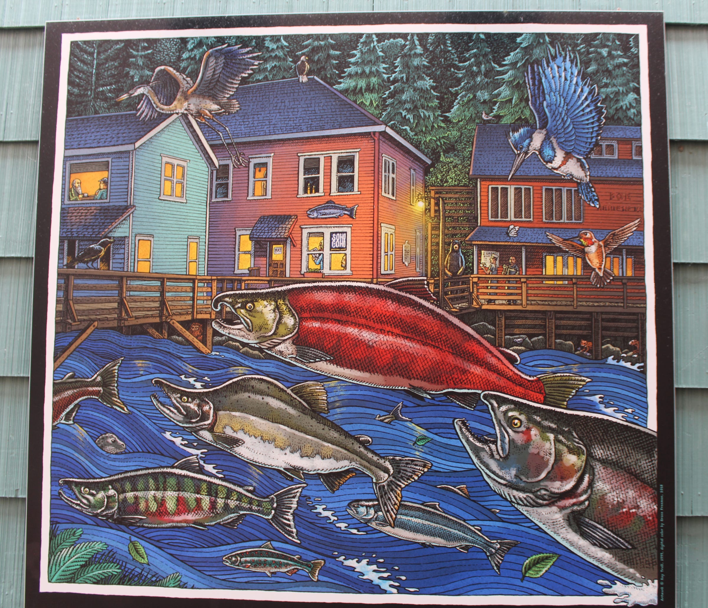 Our first port of call on our Alaska cruise was Ketchikan, and as the banner over Mission Street proudly proclaims, it’s the Salmon Capital of the World. And indeed, salmon created the city. The abundant fish lured entrepreneurs as early as 1885 and in 1890 a wharf and a cannery had been built. In 1900, with 800 citizens, the town was incorporated as Ketchikan, named after the creek the natives called Kich-xaan. The creek was also tapped to generate electricity. Industry grew with sawmills and mining. Ketchikan was Alaska’s largest city into the 1930s and had as many as seven canneries running at a time. (Thanks to Discover Ketchikan, 8th Edition for facts and figures. It’s a free magazine available at the tourist center.)