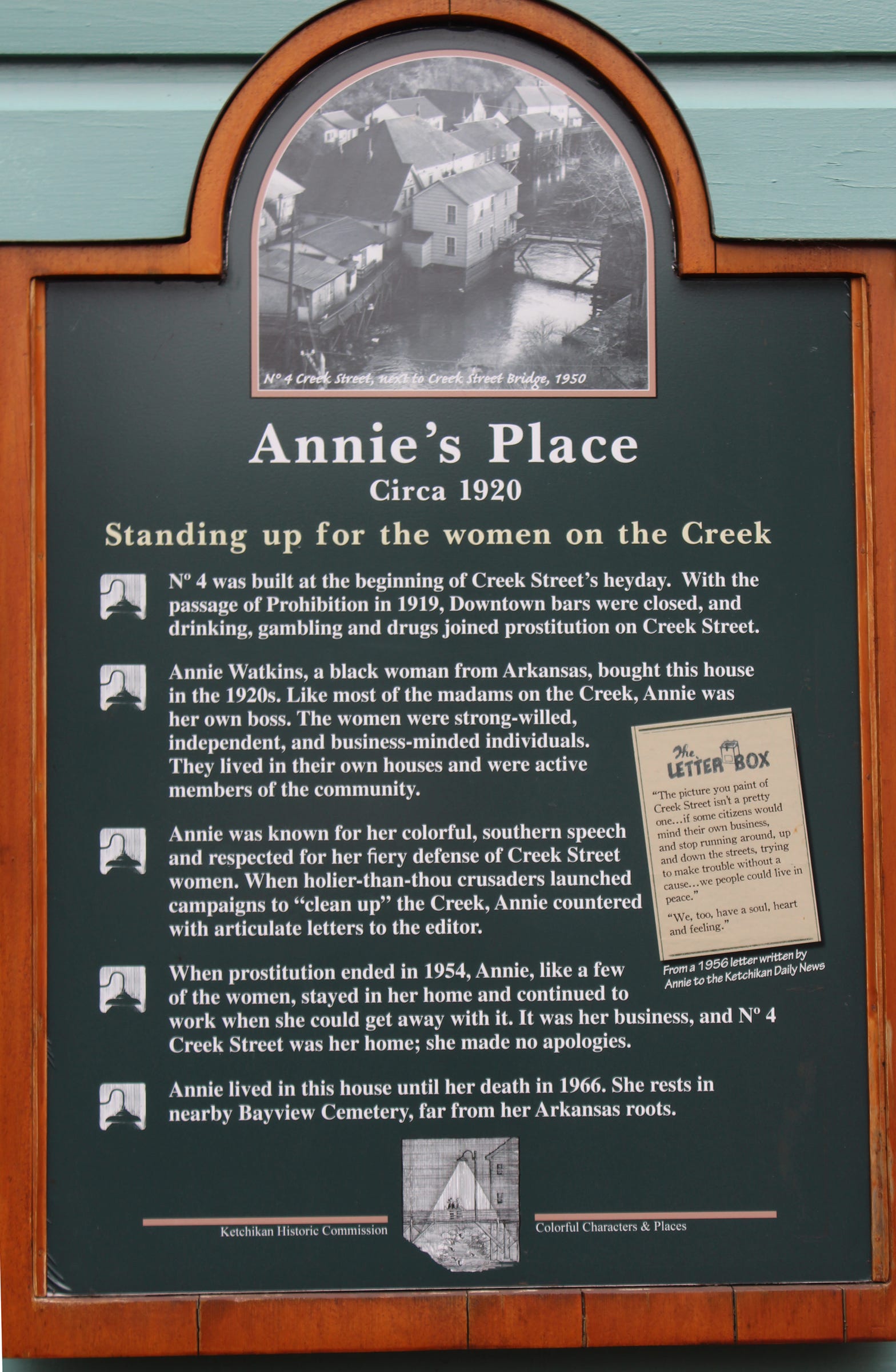 The other prominent house we mentioned earlier. Annie’s Place. Annie Watkins was a black woman from Arkansas who bought the house in the 1920s. As the sign on the house notes, she was a fiery advocate for the women of Creek Street. “When holier-than-thou crusaders launched campaigns to ‘clean up’ the Creek, Annie countered with articulate letters to the editor.” She remained in her home until she passed away in 1966.
